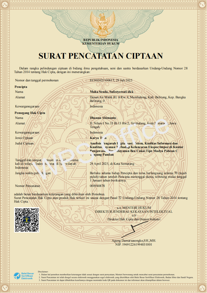Analisis Pengaruh Digitalisasi Sistem, Kualitas Informasi dan Kualitas Layanan Terhadap Kelancaran Ekspor Impor di Kantor Pengawasan dan Pelayanan Bea Cukai Tipe Madya Pabean C Tanjung Pandan